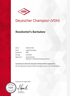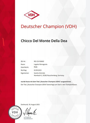 Auch Tamberì sorgte für einen ganz besonderen Höhepunkt: Auf der Weltausstellung in Helsinki setzte er sich gegen eine Konkurrenz von 154 Lagotti durch, wurde Weltsieger 2025, gewann das BOB und erreichte schließlich sogar den 2. Platz in der FCI-Gruppe 8. Tamberì ist der Vater unseres Mr. Been und unserer Angie sowie Halbbruder von Marylin und Berna. Obwohl er inzwischen wieder bei seinem Züchter Antonio Pagliaroli in Italien lebt, hat er stets einen festen Platz in unseren Herzen.